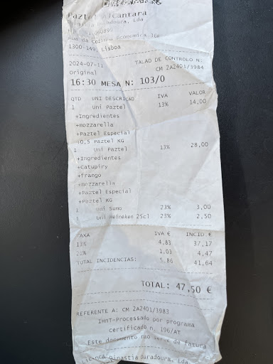 Valor dos ingredientes (marcado em amarelo) Está claro no cardápio - que estará anexado a esta resenha - que os valores de ingredientes tradicionais (€2,45/100g) e especiais (€2,80/100g) são diferentes. O absurdo, e que infelizmente só encontrei hoje, 3 dias depois, é que eles cobraram o preço de ingredientes especiais para todos os pastéis. Inclusive os dois de queijo (mozzarela), cujo ingrediente está na lista como ingredientes tradicionais (sem asterisco). Cada pastel deveria ter custado €4,90, e não €5,60. Foi um lucro de €0,70 por pastel. E isso em apenas uma mesa, num almoço de sábado. Será que é costume do restaurante, cobrar sempre pelo preço mais caro? Portanto, não recomendo este restaurante.