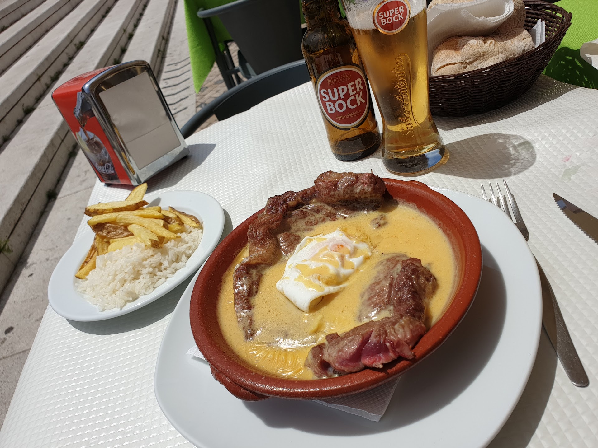 The olives that come for entrance,... Dry as raisins and not looking very healthy... Big NO... ... Sangria is sold as 500 ml jar and it fills just one glass of 250ml... ( Someone is doing maths wrong)... and... Call it something else but It's NOT sangria... That's y you can't go wrong with Super bock beer ( ordered it after rejecting the sangria...stuff...) The beer sauce steak was... Erm.... Ok?......... but nothing to write home about the sauce was TOO OILY so... Almost No flavour... (see the other comments ).