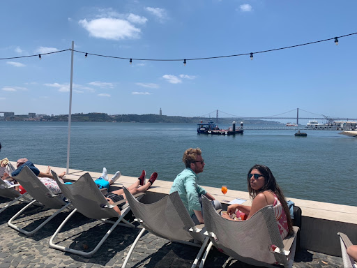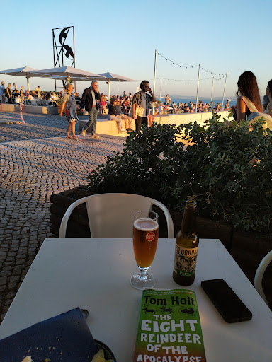 Another edit, two months later, during another trip to Lisbon: Last time I forgot to mention that I ordered a pizza. It was edible. Barely. But yes, you are here, watching this sunset, you are hungry and wouldn't mind eating something that's not really good and on the expensive side. Then this food is for you. And today I ordered a smoked-ham/cheap-cheese/rocket for the price of half a liter of unicorn blood and it's the worst sandwich I've had this century. Edible still, strictly speaking. It comes with chips and one napkin. Good stuff. The Coruja beer is still nice, however warm. The waiter smiled at me: they now have two stars...
