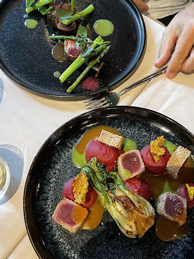 The food was fantastic — we shared the seared tuna, the duck with beetroot purée, the Iberian pork loin, and the chocolate fondant & the apple masala pastry for dessert. Everything was full of flavor and really well put together.