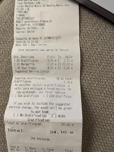 Read moreI previously really liked this place and used to come quite regularly. However, my latest experience was quite unpleasant and has put me off ever going back. We ordered three cocktails- a pisco sour (9€) and two margaritas (11€ each). However, when the bill came, it was 34,10€, as a "gratification" had been included. When we questioned this, the bartender told us that it was an obligatory extra payment, which was stipulated on the menu. We checked the menu, and it was not. The bartender told us we had to pay the full amount or we couldn't have our drinks- despite the fact that on the receipt, it says that this "gratification was optional". Furthermore, the receipt stated the "gratification" was 5%, when we were charged an extra 10%. We later queried this again with another member of staff, she spoke to a member of management who claimed this was a "mistake" and returned the money. We witnessed this happening with multiple clients (typically foreigners who didn't speak Portuguese). Pay attention to your bill and question any...