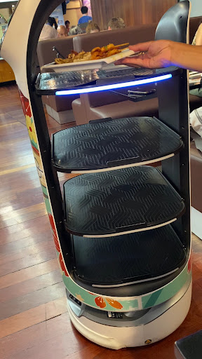 Meanwhile, my son had to watch the robot serve this other table repeatedly, but it never came back to our table. So that was extremely disappointing. When I went to pay my bill, I mentioned this to, I guess, the manager, and he did explain that the reason for this was because they only had two robots, and the other one was broken. So they only had one that one robot and it was unable to return to our table. Again, my son had to watch this one robot return repeatedly to this other larger party.