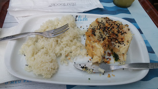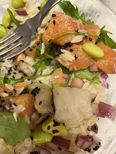 Read moreAbsolutamente horroroso. Primeiro, decidi experimentar as fish bowls. Na imagem representativa do restaurante, existe um bowl só de salmão, apesar de no menu não existir nenhum. Leva tudo pescada, ou pescada e salmão. É por pescada ser mais barata? Parece me que sim. Talheres não vinham com guardanapo, mas vou assumir que foi acidental. 10.30€ por uma meia tijela e uma água pequena. Foi o pior bowl, e o mais frio que já comi. Parece que saiu do congelador. Para além disso, o arroz parecia pó, não tive direito a nenhum molho, e o salmão estava cheio de peles como se pode ver pela foto. Não havia nenhum equilíbrio em sabor, tudo atabalhoado (aliás um verdadeiro poke bowl tem os ingredientes separados). O continente lá em baixo tem melhores bowls e mais baratas, a evitar...