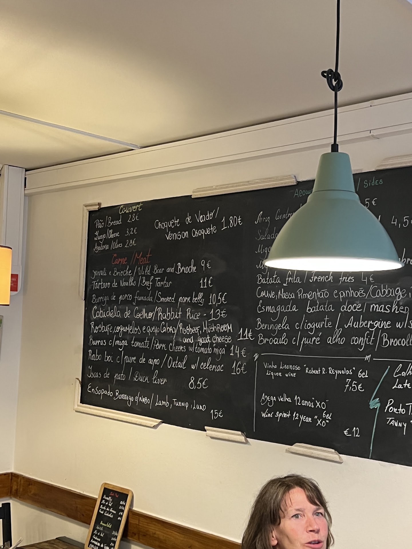Genuinely one of the best meals I had in Portugal. Sal Grosso is an adorable, cozy, hole-in-the-wall taverna serving up some of the best traditional Portuguese food I’ve had in Lisbon. It can be a smidge hard to spot; it’s tucked away in a little side street, with a simple, unassuming wooden sign marking their storefront. I probably would have walked straight on by if it weren’t for the giant line of people forming as we all waited for the taverna to open at 7 PM. Given how popular it is, you absolutely need to make a reservation; even though we got there right at opening time, we heard several groups get turned away because the place was fully booked out for the night. Thankfully, we had a reservation, and we were invited into the coziest little restaurant; the simple, rustic wooden tables were pretty tight together, with just barely enough space to shimmy through the tables. The menu was displayed on a giant chalkboard, which spanned an entire wall.