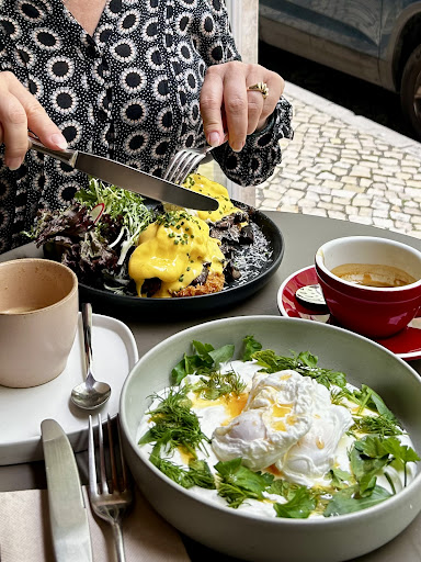 Read moreCool music, but it started out a tiny bit too loud for this lady in her mid 50s, but they turned it down (maybe someone else thought it was too loud and asked them to lower it?). Polite professional staff who spoke English. I ordered a coconut flat white, and it had teensy bits of coconut in it, and was not made with coconut milk, like in the states. I really liked it- a change of pace, and not too sweet. My hubby ordered a double espresso, and puckered every sip at the strong bright flavor. 😆 He really enjoyed his Turkish eggs, and I LOVED my eggs Benedict with mushrooms and truffle on hash-browns. The hash-browns were so crunchy and the sauce was perfection, the eggs poached perfectly! Served with some mixed greens without any dressing or olive oil. That’s the only way my dish could have been improved, although I’m guessing if I asked for olive oil and vinegar, they would have brought it, no problem, as they brought some crunchy warm toast (for 2 euros) to my hubby to sop up the yogurt in his dish. Total cost for our coffees and meals was 28 euros....