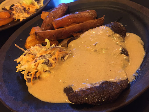 Our main course consisted of Saitan accompanied by sweet orange potato fries and a salad. We ordered an extra side of miso mayonnaise, a choice that turned out to be the crowning glory of the evening. This mayonnaise was truly extraordinary, pairing even more harmoniously with the potatoes than the other components on the plate. Although the dish was commendable, it lacked cohesiveness, saved, in part, by the exquisite mayonnaise we had fortuitously ordered for our starter.