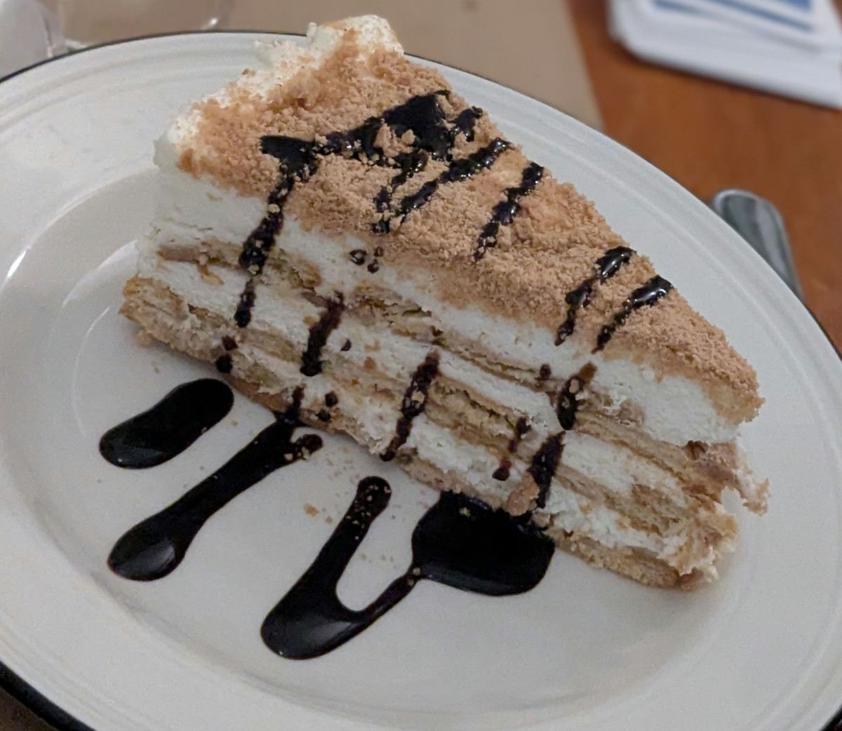 Read moreUnassuming corner restaurant on a hilly section of Lisbon. We almost passed it by, despite looking for it because there isn't much signage visible. But my goodness, what a great experience it was! The hostess was super friendly and helpful, answering our many questions about the wines and food. We started out with a bread and olive board, which included butter and olive oil. There were toasted and non-toasted slices of very nice baguette, and the olives, while not large, were very tasty, as was the peppery olive oil. The cheese was fairly soft and mild and went so well with the bread and olives. I had the pork for the main, which was a very generous helping of tender pan-grilled pork, French fries and small green salad. I wasn't able to finish all of this, but partly because I wanted to try one of the desserts, which was a biscuit cake, drizzled with dark chocolate syrup. This was a nice way to finish the meal as it wasn't terribly sweet or heavy. We came away really enjoying the whole experience, and felt that we had a taste of honest, non-touristy food - just what we were looking for....