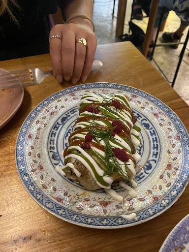 The larger plates were our favourite part! We ordered the straciatella (the heart of a burrata) served with carrots and broad beans and again drizzled with delicious intensely flavoured oils (I believe basil and chilli). This dish was our favourite I would say, all the flavours and textures harmonised so well and the creamy cheese was mopped up happily by the homemade sourdough. We then also went for the off menu pasta dish, fregola pasta in a vegan XO mushroom broth, and egg yolk. We have never tried pasta like this before, it was almost ramen-like with rich umami flavour. It was really memorable dish, and I doubt I will try anything similar for a long time.
