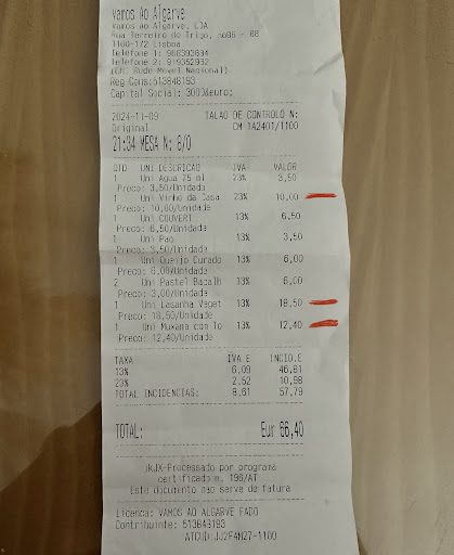 When it came time to order, we chose a glass of house wine (10 €), a “muxama” tuna toast (12.40 €), and a vegetable lasagna (18.50 €), which tasted like it came straight from a supermarket freezer. Based on my calculations, the bill should have been around 40.90 €, including charges for bread and cutlery. I estimated a total of around 46.90 €.