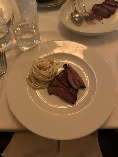 For the main course, we ordered a €75 dish for two, which naturally set high expectations. Unfortunately, the taste was underwhelming—just average at best. I had the Wagyu steak with truffle pasta. The steak was okay, but far from extraordinary, and the pasta tasted like plain cream—no hint of truffle whatsoever.