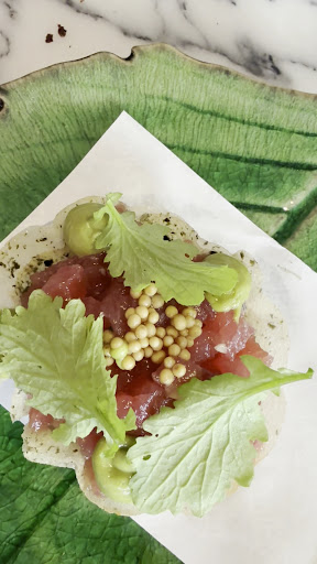 Avocado Toast : a thin cracker topped with avocado mouse and crab meat, and salmon roe … a tasty experience when the salmon roe explodes in your mouth … great fishy crusty super food starter