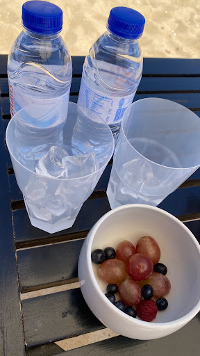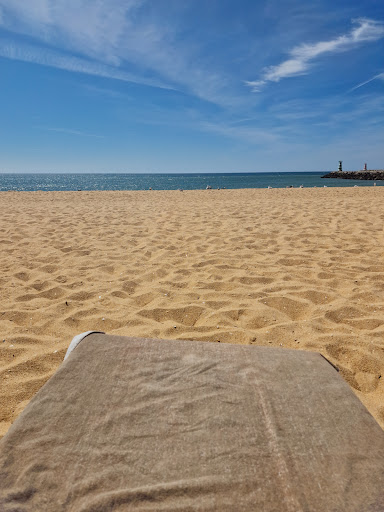 We came by this beach club by pure accident after having drinks at the hotel it’s linked to so we booked a day here , what a amazing experience , we were only staying at a local apartment in Villamora marina so this was a treat we’ll worth the money , it was £25 euros each for 2 lovely and ever so comfortable beach loungers and unberella and towels , we were not expecting the complementary bottle water and little fruit bowel