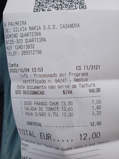 Read moreNão recomendo. Cheguei no dia 26/8/22 com mesa reservada às 13h. Pedimos uma Dourada e duas doses de Frango - que aviso já ser a ÚNICA opção de carne (pelo menos ao almoço) - ao qual passado 3 minutos volta a funcionária a dizer que não tem. À falta de opção, tivemos que comer peixe. Uma Dourada a dividir pelos três que custa 55€ (uma dourada, pois tinha um kg). Realmente fresquinha e bem assada, a Dourada estava boa. A avaliação prende-se com o serviço - sabe-se que em Agosto é propício a haver complicações mas as funcionárias do sexo feminino ignoram os clientes (infelizmente trabalho com serviço ao cliente e por muito "no lodo" que esteja não ignoro os clientes que não têm culpa). E para terminar, qual é o meu espanto quanto vejo doses de frango a sair para outras mesas perto das 14h enquanto espero pela sobremesa que também ja pedi ha cerca de 20 minutos e se esqueceram.. muito desapontada. O peixe é bom, mas não...