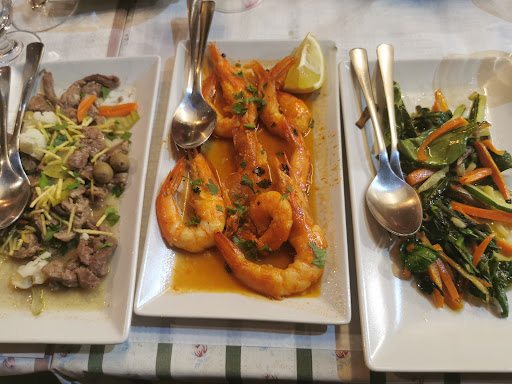 Group of 9 ate here and all very happy with the food and service. Waiters were very attentive, friendly and gave good advice. Couvert was a great mix of cheese, meat and bread. Goats cheese on bread, garlic prawns, pica pau and sautéed veg all lovely. Chorizo starter came out with flames and was a nice touch to watch them blacken it before serving (it's approx 200g of chorizo so best to share). Chocolate mousse, Caramel mousse and traditional carob cake all very good. Location is nice, just away from marina but still with a good atmosphere. Would definitely recommend, one of the favourites...