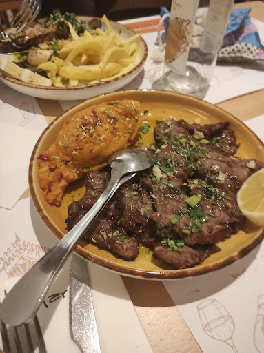 In an unlikely place, with functional decoration and typical local acoustics, we had absolutely delicious febrinhas with vegetable and entrecosto with the best migas for a long time, an absolutely delicious apple merengue dessert that was just sweet enough (so we had to repeat for the first time ever), and on top of that a €16 retail priced fantastic Symington Florão at €18; even the coffee is really good, but the best of all is the friendly, smiling, funny service.