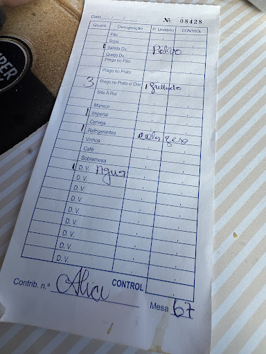 Read moreAlmoço de 14 pessoas às 13:00 já não havia o prato do dia de choco frito, depois acabou o pão, a comida veio toda desencontrada e a meio do serviço é que avisam que já não tem um prato de bacalhau. Os pratos de carne de porco á Alentejana que era também prato do dia era muito bem servido mas a carne já estava escura não era do dia e tinha sido requentada para além de vir fria. Os lagartos de porco preto tiveram de voltar para trás porque vinham crus. Acho que a única coisa que se safou foi os pregos no prato. Depois de estar quase toda a gente servida verificaram que uma pessoa não estava servida e que por sinal o prato que tinha escolhido já não havia....