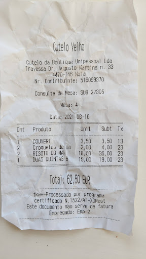 Read moreBiggest rip off I've had since coming here last year. We only had risotto and wine €62.50!. We were charged €3.50 for 'Covert' which was some butter mashed with garlic, some olive paste and bread. While we were waiting for the main course, the young lady said something about croquettes. Some potato croquettes arrived. They were tasteless but we thought they were free. €4 for two each. The risotto was €18 each. It could have been made with fresh seafood - there's a wonderful fish shop nearby with fresh seafood from Vila da Conde. It wasn't from there. It was made with a seafood mix that probably was frozen and it was overcooked and rubbery. We asked for a bottle of white wine. We were given a nice typical house wine from Duoro. €19 for something that probably cost them €2. Complete and utter...