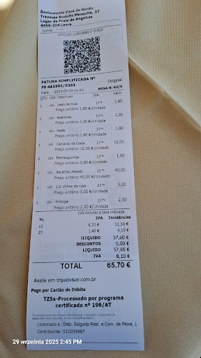 We wanted grilled sardines and caldo verde. Both dishes were displayed on the menu at the entrance. Only the soup had an asterisk, suggesting we check availability. The waiter came to our table and brought us some "treasures": bread, a few olives, butter, a tiny cup of some kind of paste, and a dozen tiny cooked shrimp. While waiting for our order, we began nibbling on the bread and butter. When the waiter came to take our order, we learned that the sardines were out of stock and that the soup wasn't being served today. After much deliberation, we ordered half a liter of wine, one beer, and a half of "Bacalhau Especial" to sample, indicating the appropriate item on the menu. According to the menu, we expected a bill of around €31 (€5 + €5 + €21). When it came time to pay, the waiter brought the bill for €65.70. He explained that the cod portion was "Bacalhau Especial" for 40 euros, and the "waitings" placed on the table were paid for. None of us ordered them, and the shrimp, which were so small they were difficult to peel, cost 12 euros, more than the grilled sardines we wanted. The waiter, in a rather arrogant manner, raised his voice and insisted that we had ordered a "large portion of cod" and refused to entertain any arguments. We paid the bill and left, dissatisfied with the rude service. On our way out, I had to ask for a receipt, as the waiter had already charged us and left. I caution potential customers to carefully check their order...