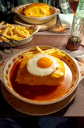 A francesinha, um dos pratos mais icónicos do menu, foi uma escolha segura. O bife estava tenro, e os enchidos, apesar de serem de boa qualidade, não se sobressaíram. O molho é bom, mas não considero uma das melhores versões da cidade. As batatas fritas caseiras estavam bem confeccionadas – crocantes e saborosas.