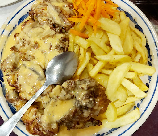 🇺🇸Home cooking! With huge portions. Not a ton of English spoken here. But if you try you will easily muddle through. Left phone at home but had the bacalao do braga. Basically fried fish accompanied by onions, peppers and garlic in olive oil and a bit of fresh black olives on top. Accompanied by oval shaped potatoes. Basically the best potatoes chips ever. Family oriented friendly and very local! We will be back again soon! You will love the price!