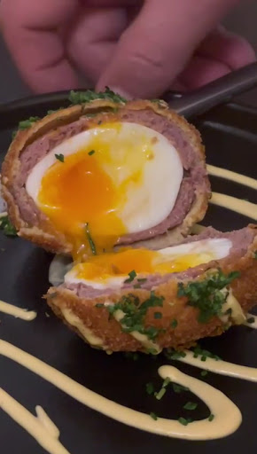 The roasted salted peppers quickly followed then shorty the homemade chorizo on fire came. The waiter instructed me to turn it over a few times till we thought it was cooked. Then he expertly killed the flame, and scraped the burnt casing off most of the link then cut it for us to chow down on. My wife said maybe we could get a doggie back and take some home to make chorizo n eggs for breakfast. Not a chance! Perfectly spiced and unctuously fatty rich and meaty, we inhaled it! Just in time for the bacalhau fried crepes, to help sop us some of the chorizo richness. The next unexpected course was a pulled duck pot pie with fresh greens to accompany. Oh man it was richer than Françoise Bettencourt Meyers! Just as we were thinking some time tonight we are gonna get that steak we ordered… Nope a scotch egg was next. We never this dish had so while Louis expertly cut it in half he explained what it was all about. Basically art mixed with chef alchemy, decadence and booming with flavor. As we sopped up the remaining bits of sriracha mayo, the main event finally arrived. But before Louis put the wooden platter down, he explains to the wife, “I know you don’t like very rare meat so if it’s not to you liking, I will ask the chef to continue to cook it, are you willing to try to taste the way we think it’s best?”