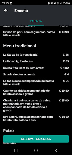 Read moreFizemos a reserva pelo aplicativo The Fork, onde consta o cardápio do restaurante, com bons valores (€46 o kilo de leitão). Ao chegarmos ao restaurante, fomos surpreendidos por um valor MUITO superior ao que consta no aplicativo (€56 o kilo), para o qual o restaurante disse que seria o valor vigente e que os preços informados no perfil ativo deles no the fork não se aplicavam. Imediatamente fomos embora, já que não seriamos vitimados neste golpe, e acabamos jantando no Retiro dos Leitões a um valor justo. Ao entrar em contato com o aplicativo The Fork, nos foi informado que infelizmente isso era pratica comum a alguns restaurantes, que não atualizam seus preços lá apenas para atrair clientes, que depois acabam pagando o preço mais elevado. Péssimas práticas, não...
