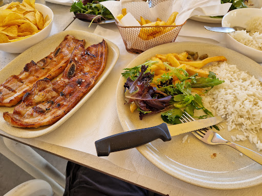Pros: The staffs are very nice and kind. Free parking and wide. Indoor and outdoor eating. Dine-in or take-out option. We ordered 2 main food (bife a casa €13.50 and entrecosto €8.50), migas €3.50, mineral water 1.5L €2.50 In total we spent €28 for us which is quite cheap and affordable. The portion is enough to share for 2 people. So, we didn't have leftovers food on the plate. Free wifi. The food is tasty and delicious. Free restroom