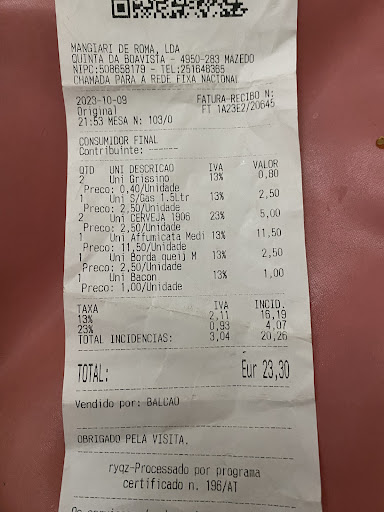Italian food, Pizza, Calzones, Pasta, all of the traditional dishes. I really do like the place, the food is well done and quite plentiful. We typically order a medium calzone and a salad with a liter of Sangria. It is plenty for two and the sangria is a little dangerous. The staff are pretty attentive and professional in the Portuguese fashion, they may have some opinions but not like pushy or anything. The local is well decorated and comfortable with a small outdoor seating area that is marginal but OK.