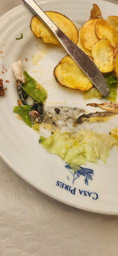 I had the Sardines with potato, and salad. My wife had the turkey steak with rice, steak, French fries, and fried, and supposed to be salad. She never received the salad, but I got mine. I asked the waiter why my wife never received her salad, he grabbed the menu and read off in Portuguese, and stated there was no salad, Then I turned the page, and in English it said salad. Then he changed his tune and stated that the salad I had was actually for the two of us. I told him that at the dozens of restaurants I've eaten at in Portugal, I've had salad served to me at that same silver oblong platter, and the platter was always for one person. As small as it was already. It was ridiculous to think that a platter of that size would be split in half. No one...