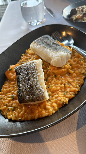 Fomos recebidos calorosamente pela chefe de sala, que substitui o José, a Joana, e o serviço de mesa foi apoiado pelas simpáticas Liliana e Daniela. O restaurante, com menos de 50 lugares, oferece um ambiente elegante. A decoração em tons escuros combina o rigor do betão com o conforto da cortiça e da madeira. A nossa experiência ao almoço foi ainda mais enriquecida pela vista deslumbrante para a Serra da Estrela. Mesmo com a sala lotada, a boa acústica manteve o ambiente muito agradável.