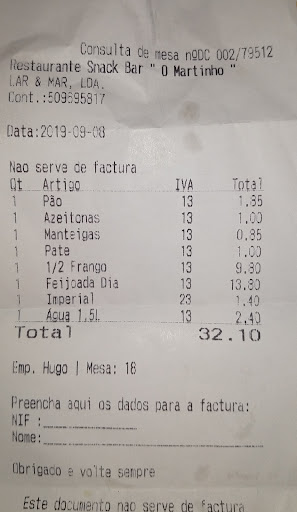 Gostaria de expressar formalmente minha insatisfação em relação ao serviço prestado durante a minha recente visita ao seu estabelecimento, o Restaurante O Martinho, localizado na Zambujeira do Mar. Além das questões relacionadas com o mau serviço, é importante destacar que minha experiência foi ainda mais prejudicada devido a sinais de discriminação durante o atendimento.