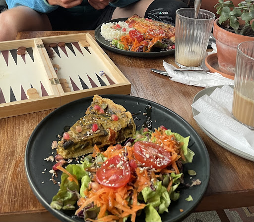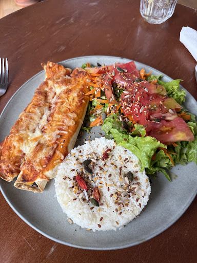 I love this restaurant. I am trying to eat healthily (looking after my micro biome) but also want food that tastes good. This restaurant fits the bill! Kasia, front of house, is very friendly and welcoming, and the dishes I tried were delicious. The menu changes regularly, and everything is prepared from fresh. I can recommend the black bean enchiladas (my choice) and the seitan stroganoff and the beetroot burger, that my son and girlfriend chose. The fresh cheese with pumpkin jam, to start, was also delicious. I am not vegetarian, but do enjoy variety. I also treated myself to a dark and stormy cocktail. Yum! This restaurant, in a quiet corner of Milfontes, is a gem, and well...