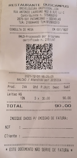 Read morePara primeira vez, fiquei deveras decepcionado. Pedi 1/2 leitão para o dia 31 dezembro e qual não foi o meu espanto quando me pedem 90 €. olho para o talão e vejo que tem escrito 3x30.00 igual a 90.00€ Ao chegar a casa, antes de se comer, e com caixa , tenha 2.450 gr. Enfim, fim de ano, a família embora pouca, aconselhou a que esquecer era o melhor remédio. Hoje reparei no talão e aqui estou a expor o meu descontentamento. Coloco uma estrela, só pelo facto de que o sabor não era mau. junto talão comprovativo. Para mim , este restaurante...