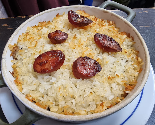 Read moreHoje fui até Algés e decidi almoçar no Águia de Algés, restaurante tradicional com comida caseira, atendimento familiar e um ambiente bastante típico, em que as mesas são em madeira, compridas e a maior parte dos assentos são bancos também em madeira, dando um aspeto pitoresco e bastante típico de uma verdadeira "tasca" Portuguesa no bom sentido do termo. Nesta minha visita veio Cesto de Pão, pires de Azeitona saborosa e um ótimo pratinho de Presunto cortado à faca. De prato principal ia com a ideia da Cabidela mas como não era dia, pedi antes uma Dose (também servem 1/2 dose) de Arroz de Pato à antiga, onde o pato é desfiado, cozido e de seguida vai ao forno com Arroz e por cima leva as fatias de chouriço para dar aquele gosto e crocancia a este excelente prato típico da cozinha portuguesa. De sobremesa escolhi uma generosa e saborosa fatia de Pudim de Ovos com caramelo. Refeição acompanhada por 1/2 Jarro de Vinho Tinto da Casa. Atendimento simpático, comida feita ao momento e preço na casa dos 15€/20€ por pessoa com entradas, bebidas e sobremesa incluídas. Ótimo restaurante no centro de Algés para quem pretenda comida caseira a preços...