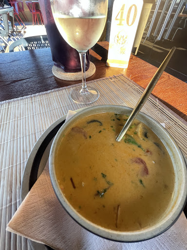 The outdoor seat was comfy but not adjusted to the height of the table. Being inside on such a lovely Summer evening felt wrong so I stayed outside. The waiter was prompt to gave me a menu but fairly slow to take a drink order or any order. I eventually ordered some vinho verde (Portuguese green white), a shrimp tom yum soup and a chicken green Thai curry.