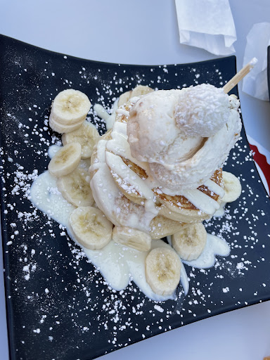 Read morePerfeito para uma sobremesa no final de jantar (gelado, panquecas, crepes, bebidas - pinacolada, limonada, milkshake...). Possui um menu com uma grande variedade de opções e os preços são considerados o normal para este tipo de sobremesas feitas com gelado artesanal e fruta fresca. O pedido é realizado primeiro e feito pré-pagamento do mesmo, depois cada pedido tem um número e é entregue na mesa. Este sistema torna tudo mais eficiente. O tempo de espera pela sobremesa, depende obviamente se esta é mais ou menos elaborada, mas regra geral considero um tempo de espera normal. Os empregados também são simpáticos e atenciosos. Facilmente a esplanada exterior enche, e os funcionários foram bastante atenciosos ao colocarem-nos mesa e cadeiras do interior, no exterior (já que no interior faz muito calor, penso que não têm ar condicionado no interior). A esplanada é super agradável e no pátio onde fica a creparia até costumam ter música ao vivo à noite. De uma das vezes que lá fomos apenas fiquei desiludida com um café que não ficou tão bem tirado (muito provavelmente apenas um azar). As panquecas são maravilhosas, das melhores que já provei, a massa da panqueca é estaladiça por fora e muito fofa por dentro....