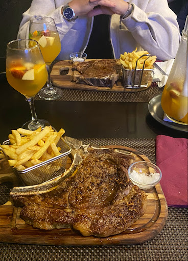 Como prato principal, escolhemos bifes na tábua — no ponto certo, super suculentos e cheios de sabor.