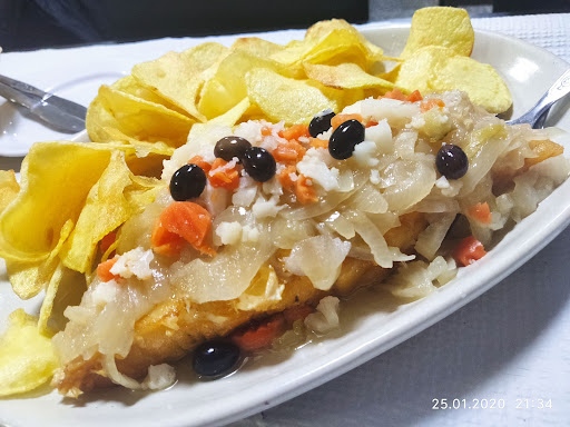 Pratos deliciosamente bem apresentados, e a especialidade, é o bacalhau frito com cebolada.
