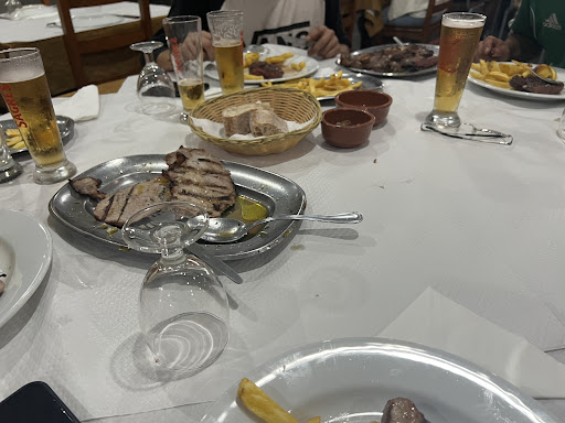 Really enjoyed this restaurant. Not the easiest place to find but well worth it. In true Portuguese style, the portions are enormous and one portion will do for two quite comfortably. We had beef, and it was excellent. No big lumps of fat, no streaks of sinew, just lovely soft neat. Massive steak, by the way, served with chips, rice and salad (also typical). You can tell this place is frequented by regulars and locals, mostly. Also, not too expensive. It is true that many restaurants do a 'daily' menu even on Sundays, at €5.50 or €6. This place doesn't at weekends, but we still only paid around €17 for us both (no dessert). Highly...