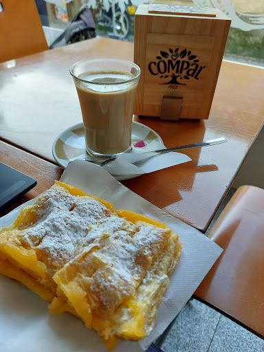 Read moreLokales Café, dass schon früh viele Gäste hat. VOM Café, Snacks, Süßes und Herzhaftes bekommt man hier alles sehr preiswert in ordentlicher Qualität. Mein Galao war etwas schwach im Geschmack, mein süßes Teilchen sehr lecker 😋 Das Ambiente ist klassisch portugiesisch, einfache Tische und ein großer TV, ...