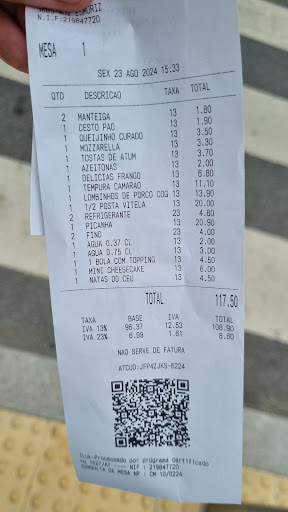Read moreDe facto o ambiente é muito bom, limpo, tranquilo, os funcionários são simpáticos. Mas é mais um restaurante que gosta de ganhar tudo de uma vez em vez de ganhar um novo cliente. Segundo a lei não podem cobrar o que o cliente não consumiu, eu não quis reclamar por 1,80€ das manteigas, mas demonstra má fé da parte do restaurante, pois é algo que cobraram e a seguir vão servir na mesa de outra pessoa. Achei as entradas pobres e muito caras, para o que já experenciei. Paguei tanto de entradas como do prato principal. Sim, só comi porque quis, mas nunca pensei que fosse ser tanto visto que era uma quantidade tão pequena. Em relação ao prato principal, a espetada de lulas é muito boa, mas nada que não se coma em outros sítios também. É um local a não repetir. Espero que melhorem isso no futuro, mas comigo não contam mais.