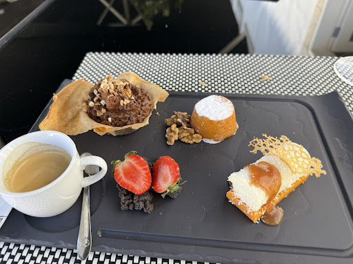 Para finalizar a nossa experiência gastronómica, pedimos duas sobremesas: Tiramisú e Café Delicado. O Tiramisú era a tradicional receita italiana, com um sabor intenso e textura cremosa. O Café Delicado era uma opção leve e refrescante, composta por um café expresso acompanhado por três mini-sobremesas: tarte de limão, mousse de chocolate e cheesecake de frutos vermelhos.