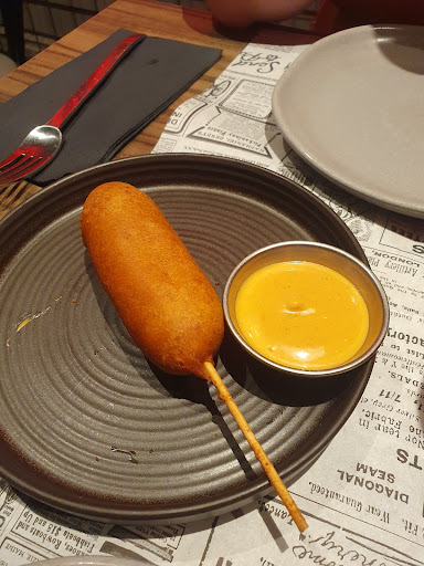 Read moreThe black and white walls with red light give a cool, grungy but somewhat cozy interior. You could definitely take great pictures here. It took a bit until we were seated, but not long. The menu was neatly created, but if you can't speak portuguese and would like to see actual pictures of the food itself instead, they also had a QR-Code which had a little bit of English in the description of those pictures. I had a "Corndog" Normal, shared the "Vira o Mexico" with my friend and we both had a "Mitico XL" and some milkshakes. I had the red fruits "Frutos Vermelhos" and she had the salted caramel Milkshake and a Coffee. The Corndog was really nice and as I expected. My friend thought of it slightly fatty, but I didn't have that Problem. The Mitico XL was on the other hand extremely fatty and I barely got it down. We also felt like something was missing, but it was generally good. We were even asked how we wanted our meat. All that for the 2 of us was a lot, I barely got it down. The milkshake was a great help though. The employees were really nice, friendly and helpful, even checking up on us if we're ok.