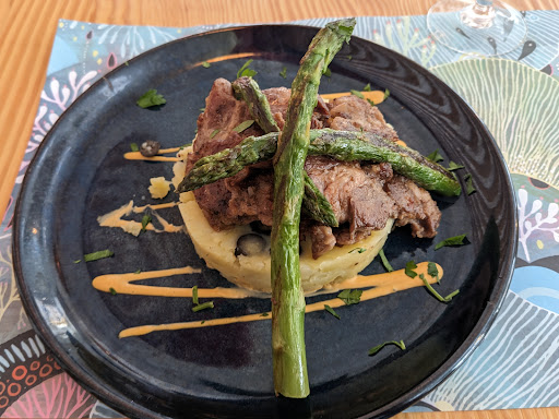 Read moreExperiência excelente! Tudo top. Atendimento simpático. Decoração cuidada, estilo náutico, com cadeiras almofadadas em vez de sofás, confortável, nível de luz adequado. A comida é tão boa que fiquei curiosa em provar todos os outros pratos que não pedi. O queijo de cabra é um queijo inteiro, não apenas algumas fatias. O estabelecimento teria vantagem em referi-lo no menu. É caramelizado por cima e vem acompanhado duns legumes crocantes e maçã que combinavam tão bem. Preço justo. Tão magnífico que fiz questão de parabenizar o chef. Pedimos também batatas temperadas, cozidas com casca e levemente picantes, para molhar na maionese. Quantidade superior à esperada numa tapa. Divinal! O tofu panado com queijo por cima, legumes e batata frita picante são óptimo também, para não variar. As opções vegetarianas são umas 6 ou 7, mais do que o habitual num restaurante não exclusivamente vegetariano. Infelizmente não há hambúrgueres vegan, mas o chef estava a pensar em renovar a...