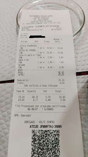 O funcionário era muito simpático, mas tudo o resto foi muito mau. Pedimos um "bife de frango à delicia", uma "vitela no churrasco", e uma salada que o funcionário disse que "era à parte". Veio um prato com dois bifes de frango com batatas pré-feitas salgadíssimas, acompanhado com uma pequena porção de arroz cheio de gordura. O outro prato tinha três pedaços de carne cozidos sem sabor, que pareciam terem sido aquecidos no microondas, e o arroz também a boiar em óleo. A salada tinha três ou quatro pedaços de tomate, uns quantos aros de cebola e umas folhas de alface, tudo também salgadíssimo. Sabíamos que íamos pagar 13,50€ por cada prato (que dado as doses e a confeção é um valor absurdo), mas pagar 4,50€ por uma salada nunca imaginei. No fim também cobraram o gelo e o limão da Coca-Cola...