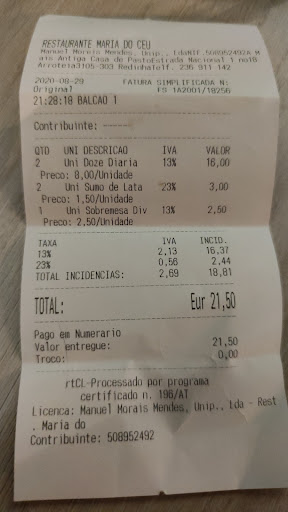In sintesi, il Restaurante Maria do Céu non è solo un ristorante, ma un'esperienza. Se cercate un luogo dove gustare il vero Portogallo, lontano dai ristoranti turistici, con un rapporto qualità-prezzo eccellente e la certezza di trovare cibo di qualità e in abbondanza, questo è il posto...