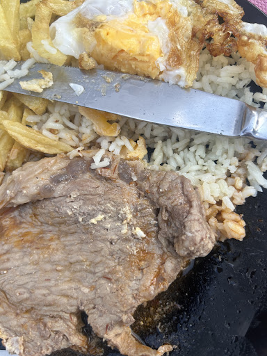 The fries had no salt but where at least fried, which was not the case with the guests sitting at the table next to us. They were given floppy potatoe sticks that were fried just long enough to soak up some oil and get all wiggley. Worse than the food was the service. One guy had a tablet and was able to take orders and handle payments, the rest seemed friendly but unable to do anything but clean tables and call for (shout at) him. Our tablet waiter had no visible plan and headlessly ran from one table to another. What he was good at is ignoring you even if it was obvious that he heard and noticed you. After asking to pay for three times, I finally was allowed to hand him some money with which he disappeared, not to give me my change, but to wait on some other tables. I had to remind him, that he still owes me change after which he disappeared again for a few minutes. Worst place I've been to in a very long time....