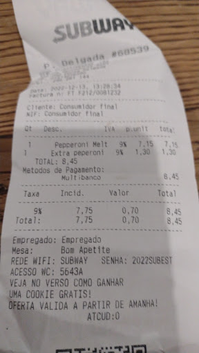 Read moreDomingo dia 16/5/2021. Subway Ponta Delgada Venho por este meio demonstrar o meu desagrado com o atendimento ao cliente e mesmo a própria comida. Atendimento péssimo de muita baixa qualidade pessoa arrogante. Terei pedido 2 frango teriyaki no qual estavam muito mal preparados, pedi com queijo mussarela sem salada e com molho barbicue. O pão estáva minimamente bom,o molho foi de tal forma exagerado que só comia era molho barbucue não sentia os restante ingredientes, o queijo tava procurado ou seja 1 colher de queijo basicamente num pão inteiro, terei pagado cerca de 18 euros que é um absurdo pelo que é fornecido ao cliente ( 2 bebidas e 2 pacote rufles de batata). Minha esposa já terá comido uma vez lá e a pessoa que atendeu anteriormente teria sido simpática e ter feito uma grande...