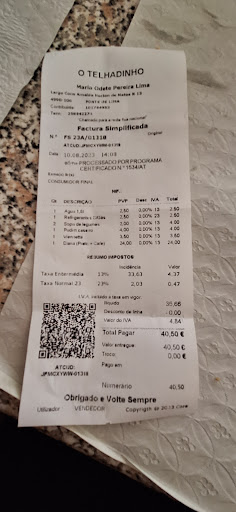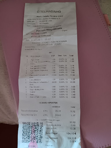 Read moreResumindo fomos enganados pagámos quase 25€ por pessoa. Primeiro serviço pessimo, estivemos quase meia hora só para nos atenderem na mesa, mais 45 min porque pedimos um prato que não era do dia, até aí menos mau. Perguntei se funcionavam por menus, os pratos do dia sim 8,5€, nesse dia era bife, o prato+bebida + sopa. Só a minha neta quis o bife (menu 8,5€), pedi o menu e perguntei, o bacalhau à telherinho era como, a Sra. explicou e disse que dava para três pessoas, (com estas palavras) 1 dose (31€), foi o que pedimos para 3. O meu genro pediu filetes só o prato (12,45€). Fazendo as contas por alto, pensámos que ficaria uns 60€-70€, nao comemos sobremesas. QUando fomos pagar pediram nos quase 105€. Pedi a conta para perceber o porquê tanto, vi que cobraram 49€ - 1 dose do bacalhau, questionei a Sra. Não era o que estava no menu, nem o que ela tinha dito. A Sra. Disse que estava bem, porque era 1 dose e meia, percebemos que nos tinha enganado, à cara podre...tb meteram a sopa à parte que era do menu 8,5€, comemos 2 pães torrados meteram 5...para não nos chatearmos mais viemos embora....mas deixo aqui o nosso desagrado, porque fomos mesmo enganados com má intenção, infelizmente ao perceberem que não "somos da terra"...