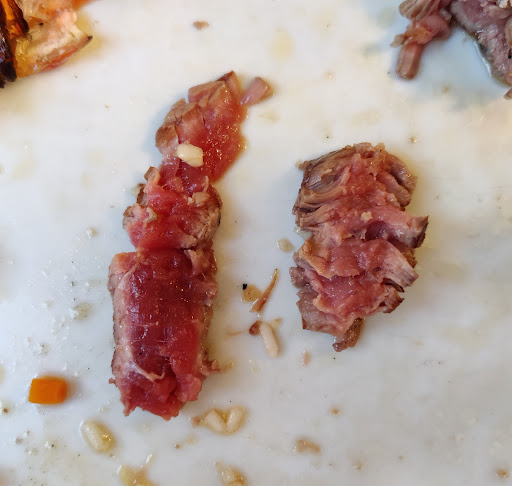 Entretanto, entrámos, e acabamos por esquecer un pouco o assunto. Encontramos uma ementa reduzida, que até seria algo que não nos iria incomodar, uma vez que aquilo que iríamos comer estava presente na mesma. Três do nosso grupo pediram rojões à minhota (não vou criticar a dose 🤣 e nem quero entrar pela parte da "reduflação"🤫), mas o que é que aconteceu? Simples: lá vieram os "rojões", e depois de muito esperar-mos (cerca de vinte minutos), lá vieram os acompanhamentos (o arroz de sarrabulho e arroz branco).